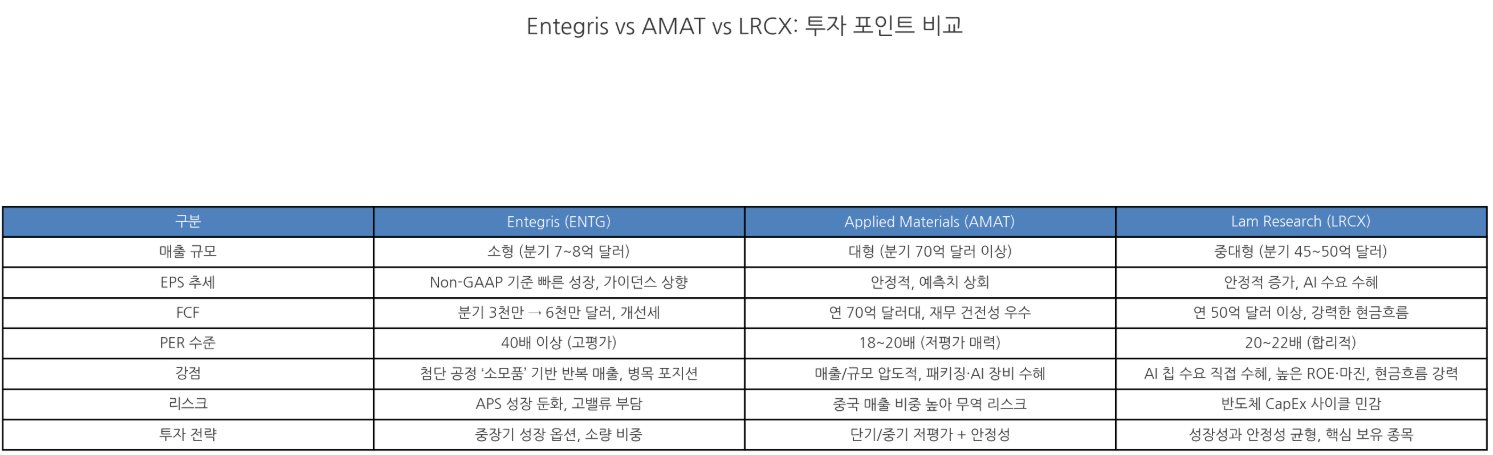 ▶ 결론: 투자자 입장에서는 Entegris보다는 AMAT와 LRCX가 자본 생산성 측면에서 훨씬 매력적입니다.
