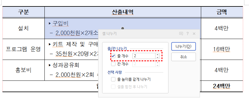 ② 블록설정한 셀의 줄을 2개로 나누고 싶으면 아래 그림과 같이 "줄개수 2"로 입력합니다.