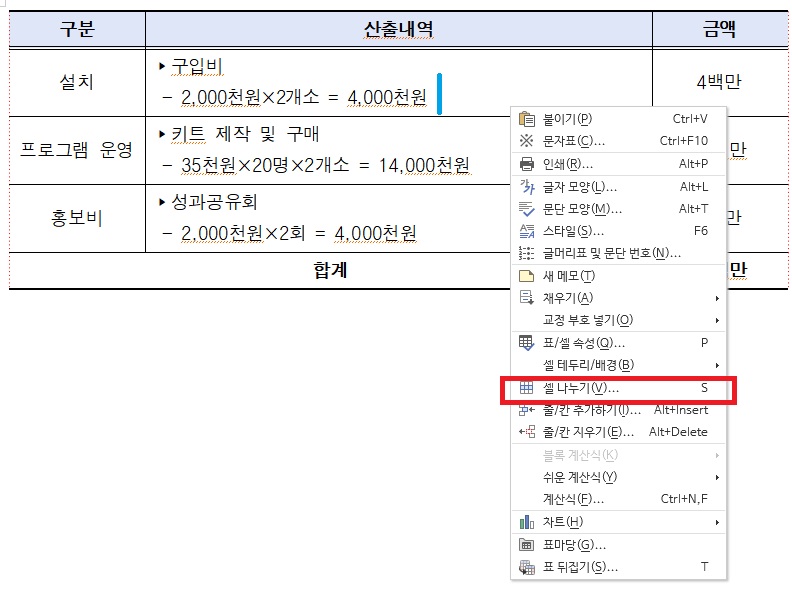 ① 나누고 싶은 셀에 커서(아래 그림에서 파란색 선)를 두거나 셀 블록을 한 뒤 오른쪽 마우스를 클릭하여 셀 나누기를 선택합니다. 또는 나누고 싶은 셀 블록을 한 뒤 단축키 "S"를 누릅니다.